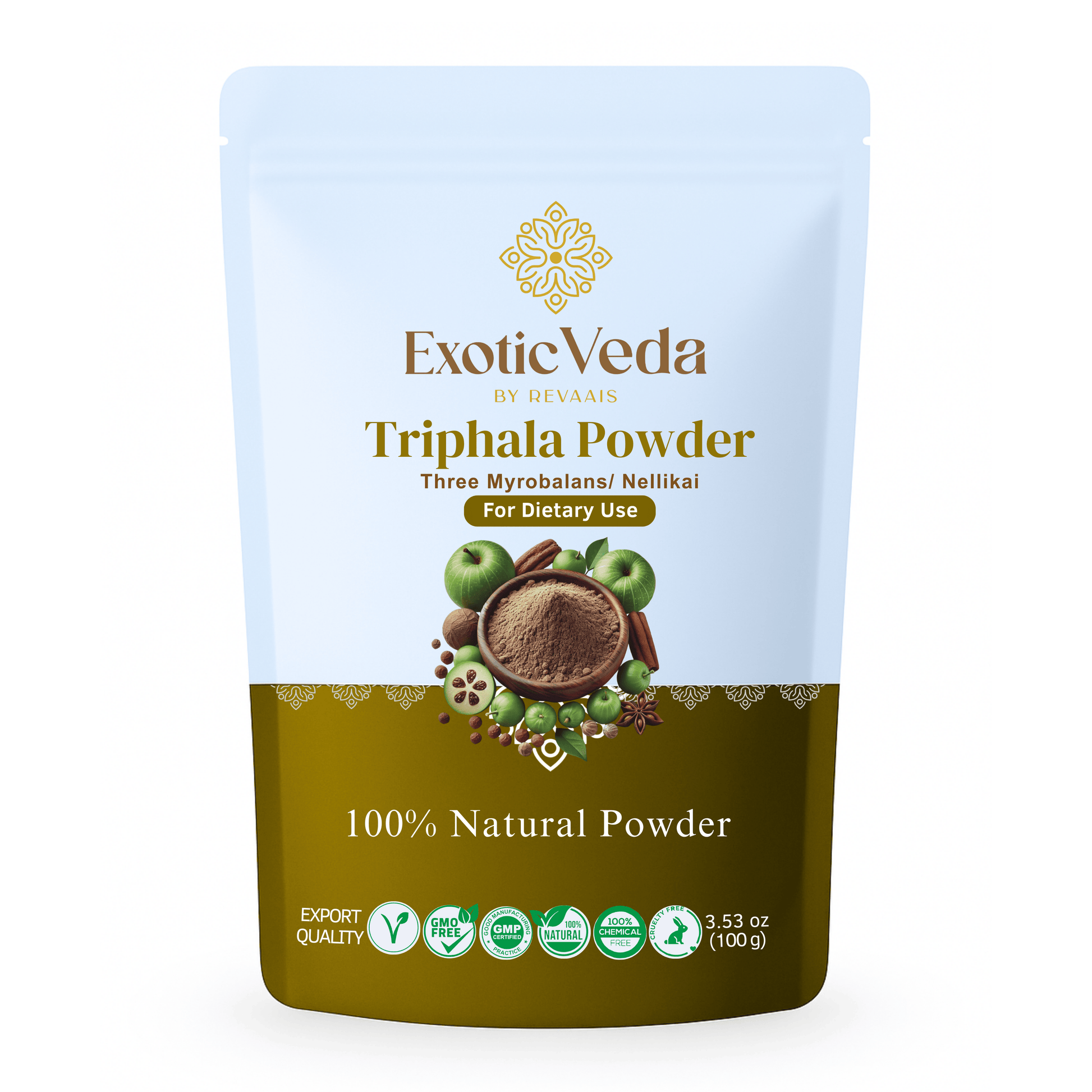 Experience the traditional goodness of Triphala Powder, a blend of three powerful fruits: Amla, Bibhitaki, and Haritaki. This time-honored Ayurvedic formula is known for its balanced properties, promoting vitality, digestion, and overall well-being. Exotic Veda's Triphala Powder** is made from the finest natural ingredients, free from GMOs and harmful chemicals, ensuring a pure and effective way to boost your health and energy. Incorporate it into your daily routine to enhance your body's natural detoxification process and promote digestive health.